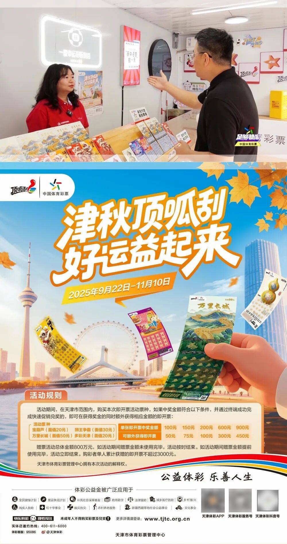 当金秋的风掠过海河之畔,当梧桐叶染上斑斓的秋色,在这个充满收货与希望的季节,天津体彩推出了“津秋顶呱刮 好运益起来”即开票赠票活动。本期的《津彩热点发布》就让我们一起到体彩实体店,了解一下活动的具体内容吧!