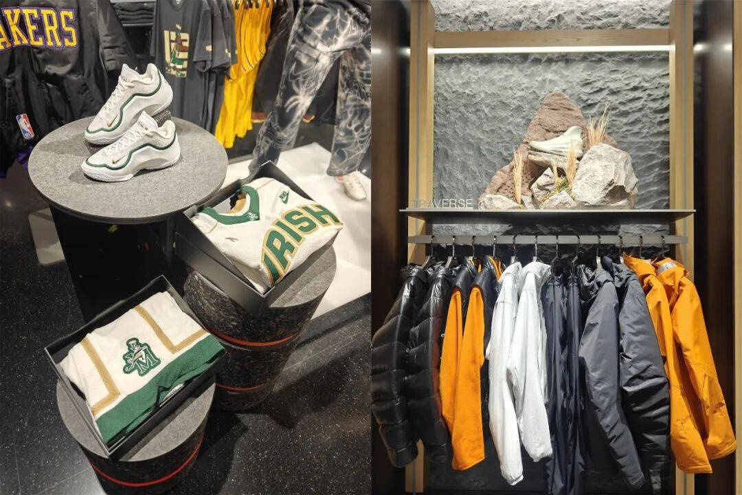 在耐克门店,当他们推广詹姆斯23代的高中主题配色时,会在球鞋旁边放上同款主题的球衣和球裤,使得这个产品展示的故事性更加完整,对于詹姆斯的球迷会有更强的吸引力,并且激发潜在的连带消费欲望;而在始祖鸟门店,挂着冲锋衣的货架上往往摆着一款越野鞋,让消费者在选衣服的同时,加深对品牌各类鞋款的印象。