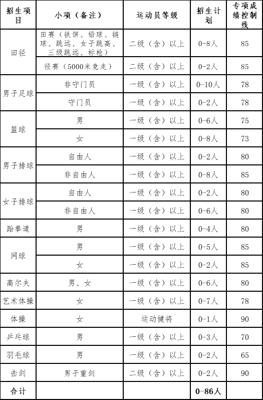 2.拟增加计划的项目顺序及数量为:男子排球(非自由人)2人、男子足球(非守门员)2人、女子排球(非自由人)1人、男子篮球2人、田径(田赛)2人、男子网球2人、女子网球1人、艺术体操1人、高尔夫2人、乒乓球1人、羽毛球1人、女子篮球2人、跆拳道1人。各项目计划一次性增加到位,如项目二志愿无有效生源或有效生源不足,则不增加或按实际有效生源数增加计划。