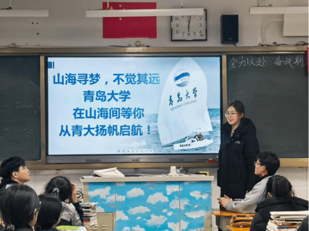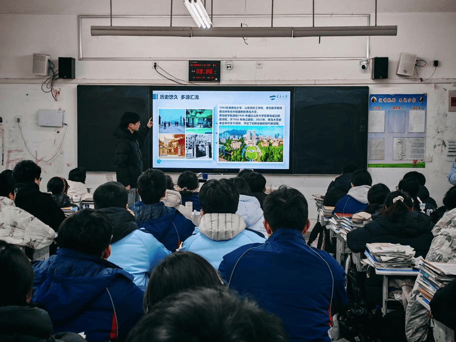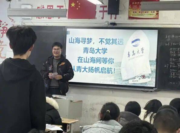 物理科学学院“齐鲁情、青大梦”实践团前往山东省滕州市第一中学,开展“心系母校 梦圆青大”招生宣传实践活动,以青春之力讲好青大故事。实践团以“历史久、学科全、规模大、发展快、贡献大”五个关键词为指引,情真意切地把青岛大学的故事讲清、讲透、讲活;播放宣传视频,通过宣讲传递青岛大学的招生理念,通过互动答疑拉近与高三学生的距离,获得了学弟学妹们的广泛认可。宣讲结束后,同学们纷纷询问青岛大学的招生政策、专业设置以及校园生活等内容。通过线下宣讲推介青岛大学,成员们在实践中深化了知校、爱校、荣校的情怀,为学校的高质量发展及教育强国建设贡献了青春力量。