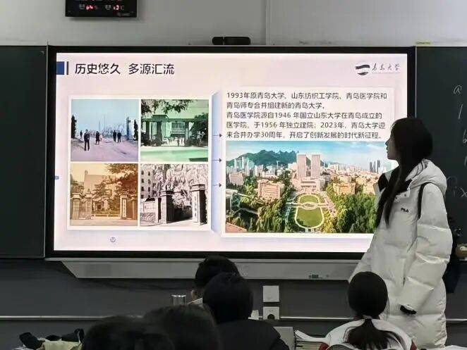 纺织服装学院虹祺实践团走进青岛十七中,开展“跨越山海 相约青大”招生宣传实践活动。团队成员以亲身经历为载体,通过PPT展示、经验分享、互动问答等形式,向学弟学妹们介绍了青岛大学的办学特色、专业优势及丰富多彩的大学生活。宣讲中,成员们结合自身学习经历,分享了专业选择、备考经验及大学生活感悟,并就大家关心的招生政策、专业前景等问题进行了细致解答,现场气氛热烈。此次活动不仅让学弟学妹们对大学有了更清晰的认识,也让团队成员在实践中锻炼了表达与沟通能力,以青春力量传递榜样力量。照片说明:图为团队成员在宣讲现场,向学弟学妹们介绍青岛大学校园风光与学科建设情况。