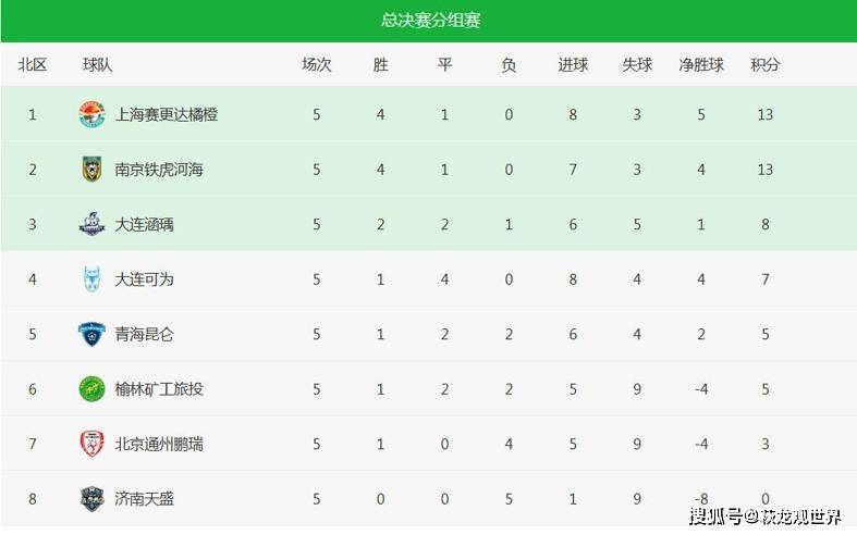 (注:中冠总决赛A组积分榜上,大连涵瑀积8分,排名北区第三,大连可为积7分,排名北区第四。)